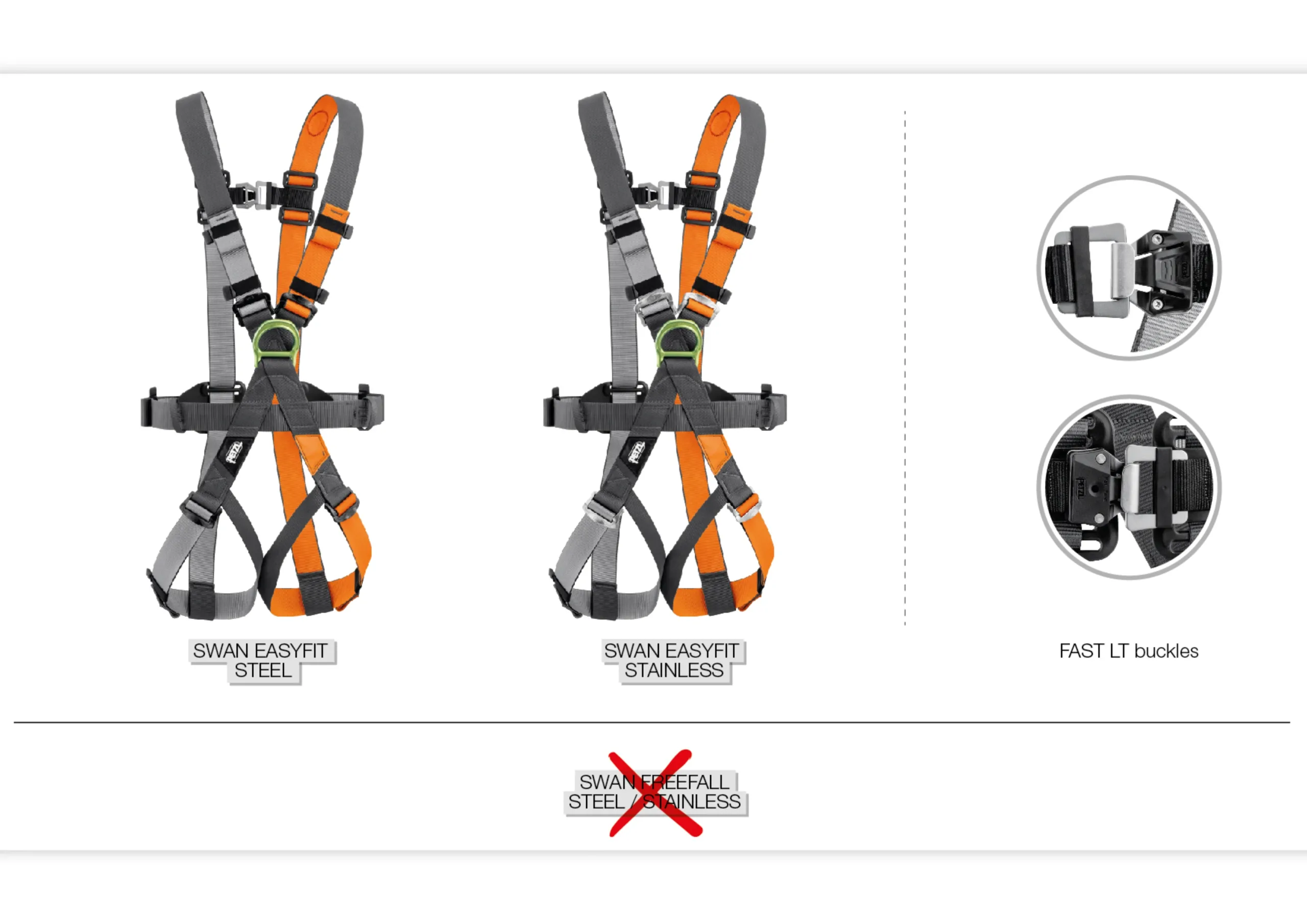 Petzl dobrovoljno opoziva SWAN EASYFIT STEEL pojaseve (referenca C062AA00 pojedinačni i C062AA01 – pakovanje od 5 kom) i SWAN EASYFIT STAINLESS pojaseve (referenca C062BA00 – pojedinačni i C062BA01 – pakovanje od 5 kom) zbog nedostatka na FAST LT kopči koji može dovesti do kobnog pada. Molimo vas da odmah prestanete koristiti pojaseve pogođene ovim opozivom.