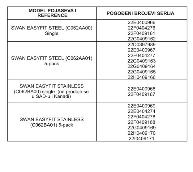 Opoziv se odnosi samo na određene serije SWAN EASYFIT STEEL pojaseva (referenca C062AA00 za pojedinačne pojaseve i C062AA01 za pakiranja od 5 komada) i SWAN EASYFIT STAINLESS pojaseve (referenca C062BA00 za pojedinačne pojaseve i C062BA01 za pakiranja od 5 komada) podliježu ovom opozivu.